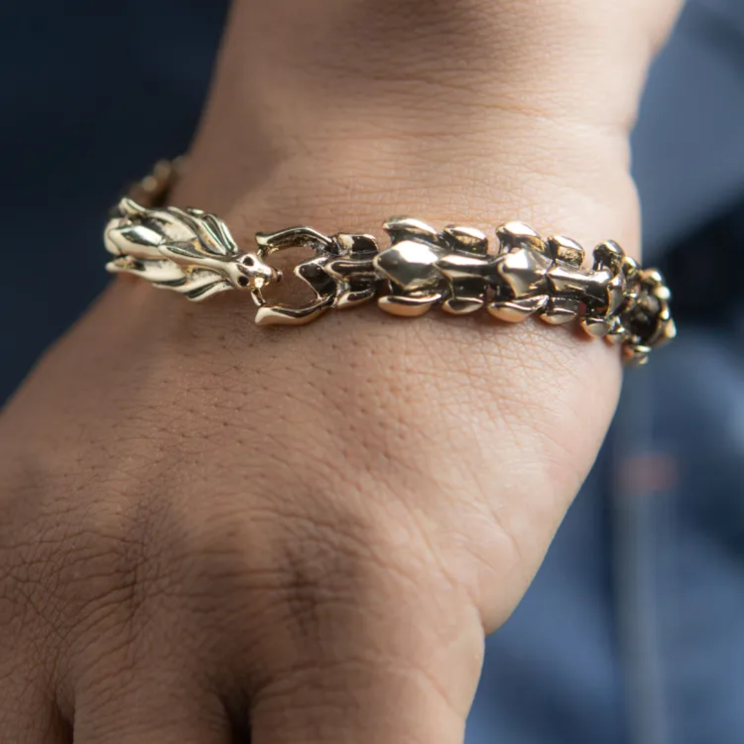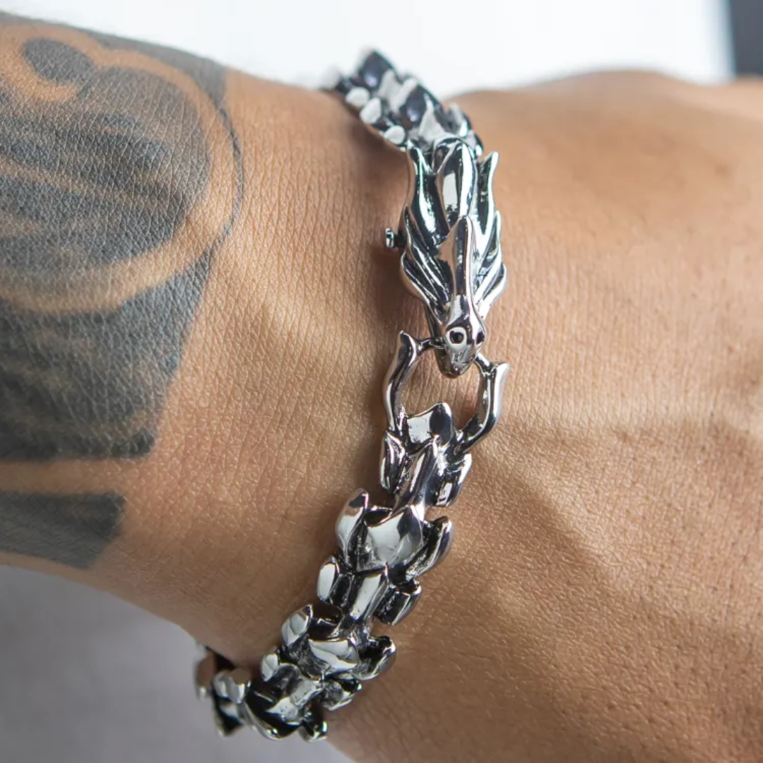 Discover the Dragon Silver Bracelet, a unique handmade boho hippie charm bracelet that serves as the perfect gift for him. This vintage men's jewelry piece features an exaggerated dragon head, adding a touch of hip-hop punk and retro flair. Crafted from a durable and hypoallergenic alloy, this bracelet ensures long-lasting quality, although it should be kept away from water. With size options ranging from 19cm to 22cm and available in three captivating colors, you can easily find the dragon bracelet that suits your preferences and provides an impeccable fit. Its exceptional design boasts a button-like opening and showcases a dragon motif with a distinct dragon scale back, creating a one-of-a-kind aesthetic. Whether it's Valentine's Day, Christmas, or Halloween, this dragon bracelet makes an ideal gift for your boyfriend, relatives, friends, or classmates, radiating decency and eliciting genuine appreciation.