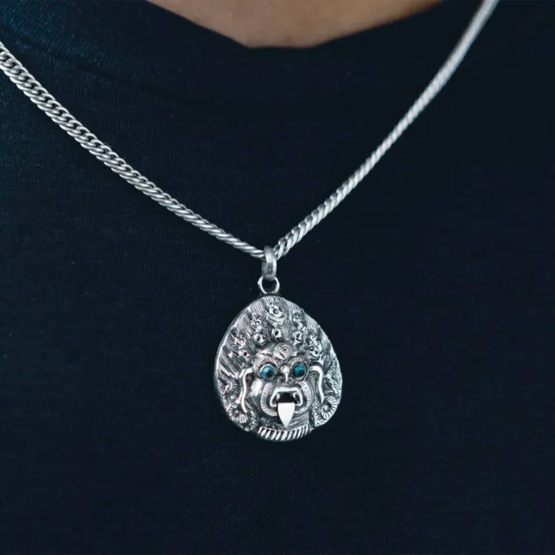 This exquisite Bhairav/Bhairava/Bhairab pendant in pure silver is a fine example of handcrafted jewellery that is stylish, attractive, and skin-friendly. Perfect for both men and women, this unisex locket is fashioned from the highest quality materials and features an eye-catching design that is sure to turn heads at any event. Made entirely of pure silver, this pendant is a testament to fine jewellery craftsmanship and attention to detail. Whether you are looking for a fashion-forward accessory to complete your outfit or a meaningful gift for someone special, this pendant is a must-have. So why wait? Add this stunning piece of jewellery to your collection today and experience the beauty and elegance of handcrafted silver pendants for yourself!